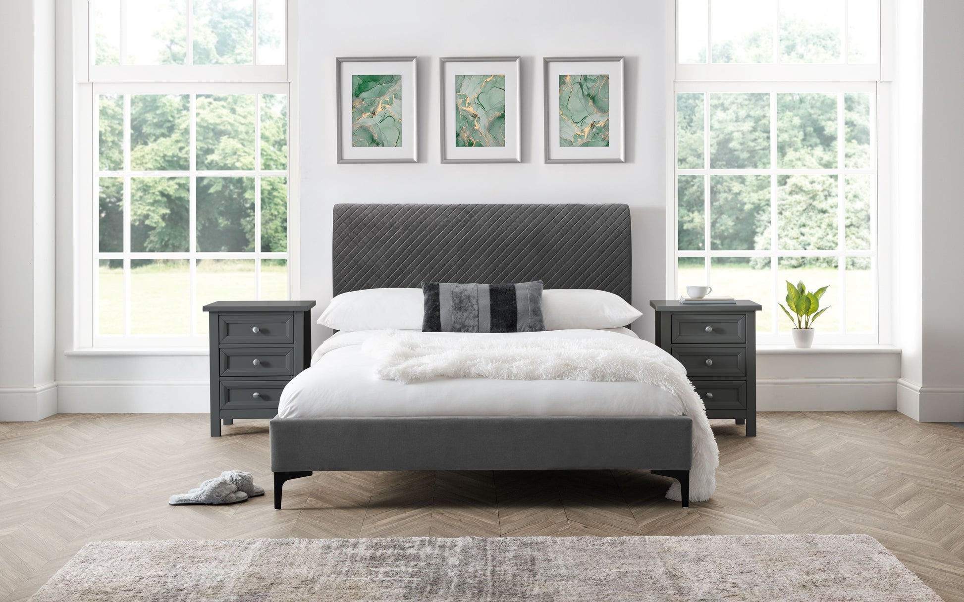 The Sanderson is an elegant, luxurious bed which features a tall, plush headboard entwined with exquisite diamond stitching. In a beautiful grey velvet finish, the Sanderson is destined to be a graceful addition to a wide range of décor styles. Available sizes: double, king and super king size.
