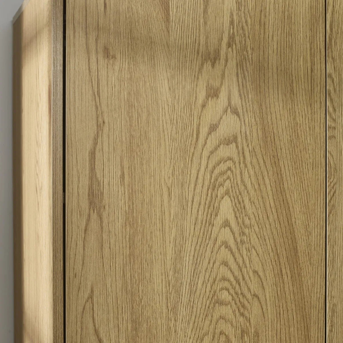 Keep your bedroom organised with this 2 door wardrobe. Finished in a warm light oak effect with beautifully natural grain texture and bold black accents, offering the perfect contrast. As the doors open, inside you’ll find a spacious hanging rail for clothes and a practical shelf for folded items or shoes, all complemented by sleek black recessed handles. Its sturdy construction and industrial-inspired design make it a versatile addition to modern and minimalist interiors. Self-assembly is required.