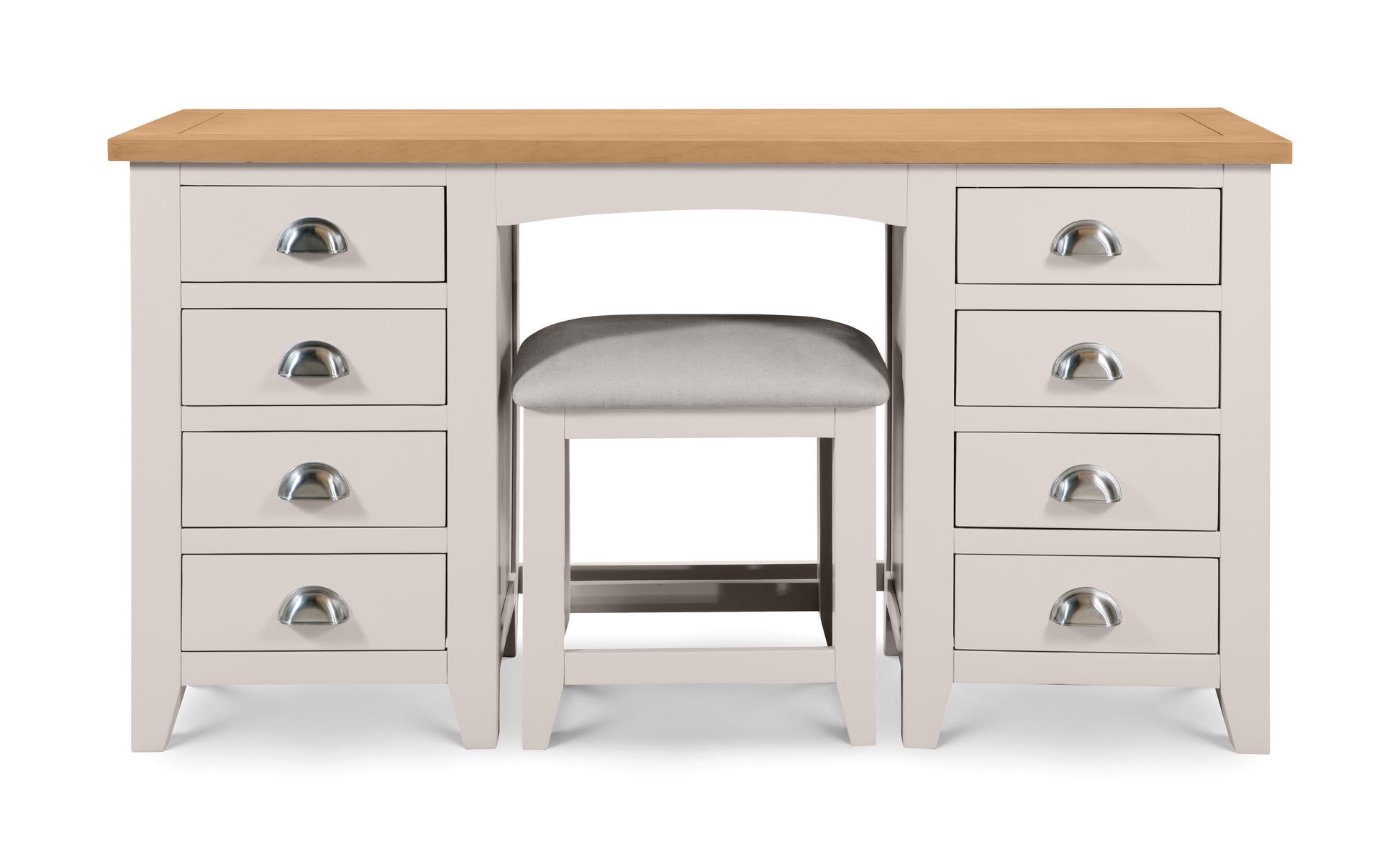 Finished in a elephant grey lacquer, the Richmond bedroom range is a timeless, elegant design suitable for a wide range of décor. Constructed from white oak and oak veneers, this lacquered bedroom range brings a modern twist on a traditional construction. Suitable for those with set morning routines, this twin pedestal dressing table offers a spacious surface as well as 8 drawers for your cosmetics. Stool Not Included.