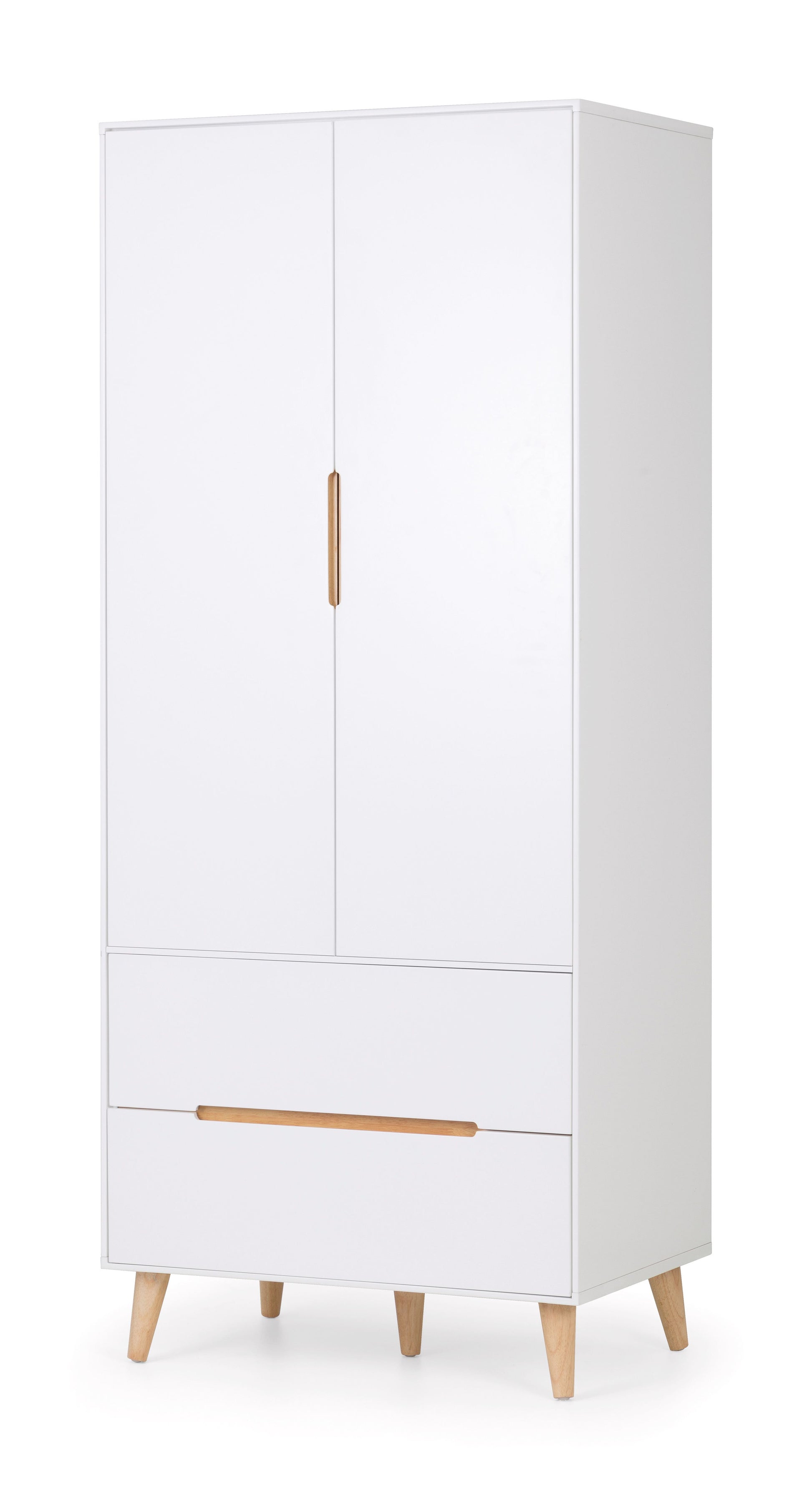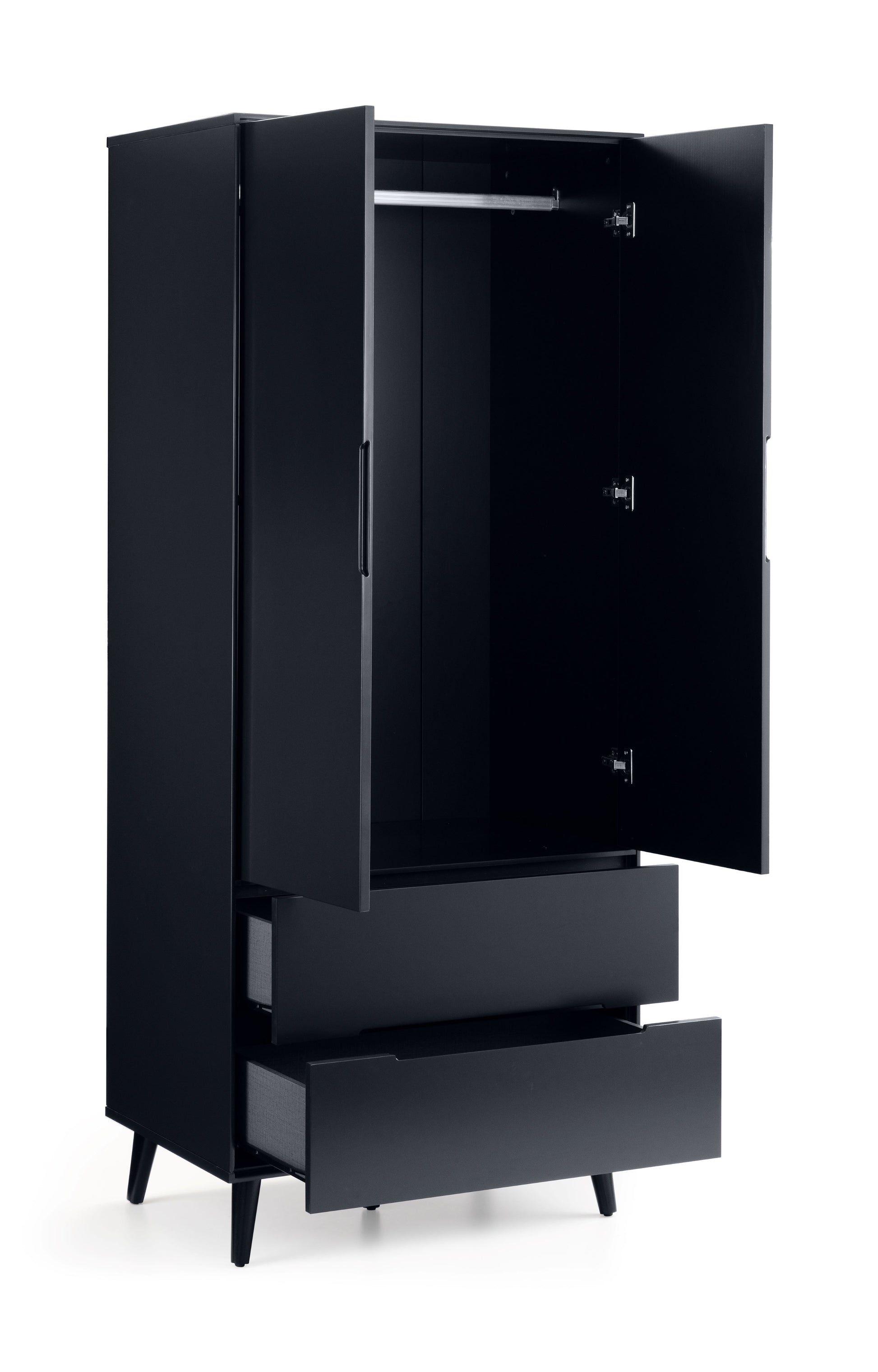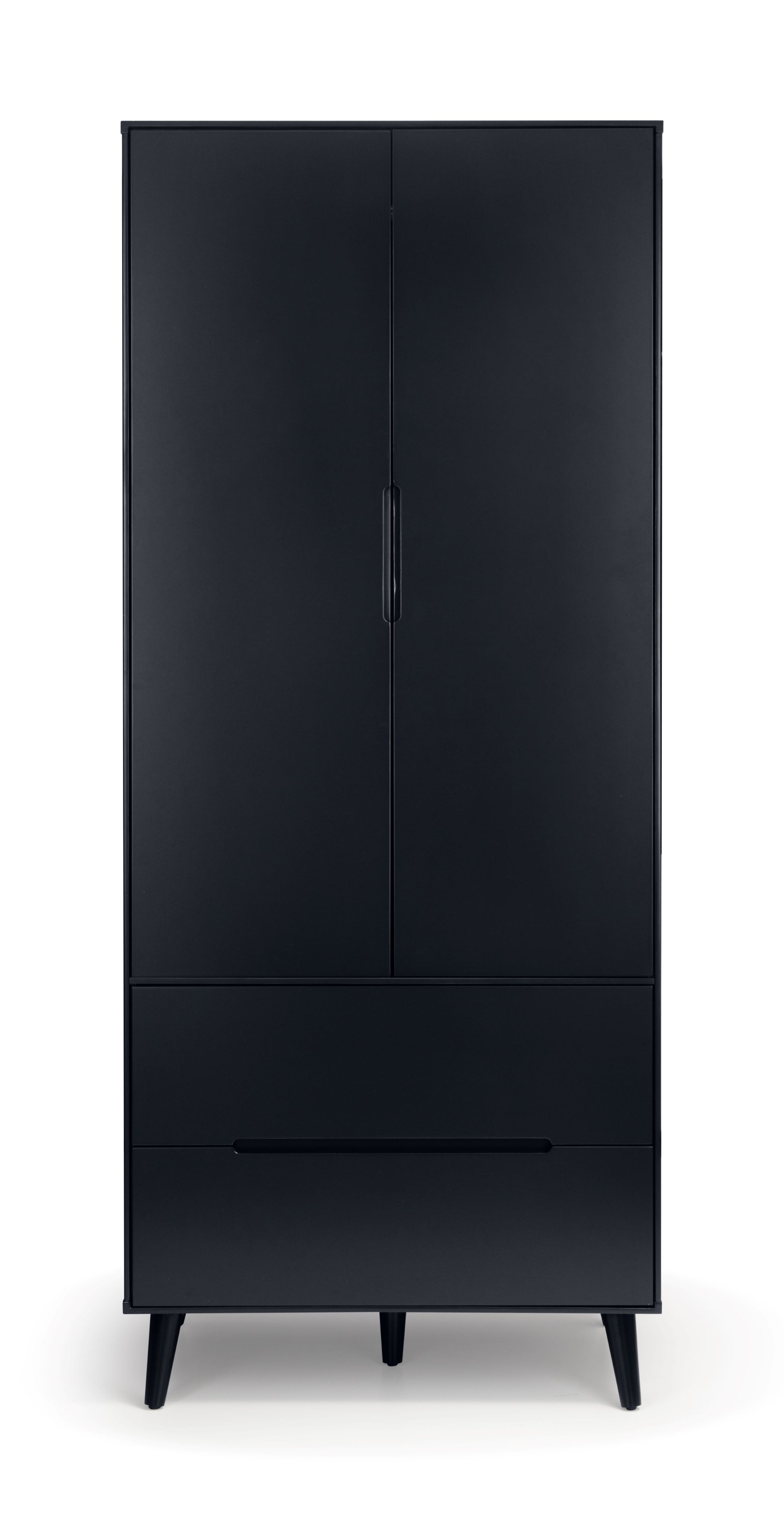 A stylish, retro-inspired combination wardrobe with two drawers in an immaculate matt anthracite or white lacquered finish, with complementary tapered oak finish legs and recessed handles to provide easy opening. The sleek Scandinavian feel fits beautifully with any décor.