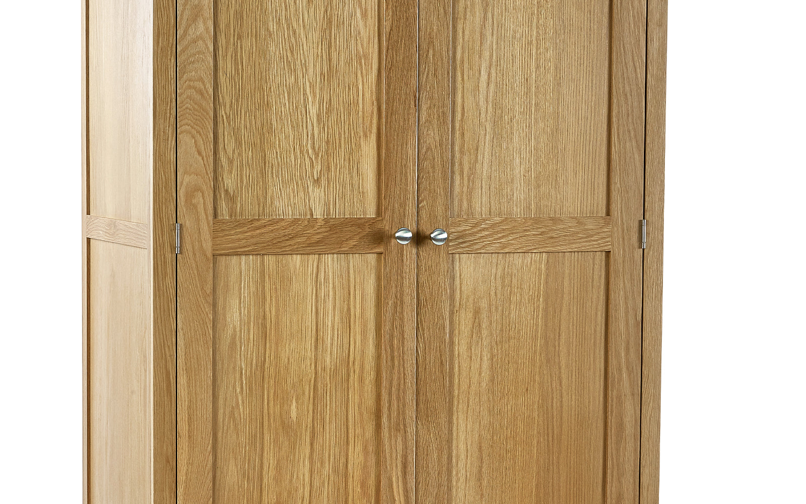 Crafted from solid oak and oak veneers the Mallory Combination Wardrobe ensures style and lasting durability. Featuring a spacious double door design and an additional drawer, this wardrobe provides plenty of storage for clothing. Finished with round silver knobs, perfect for any bedroom space.