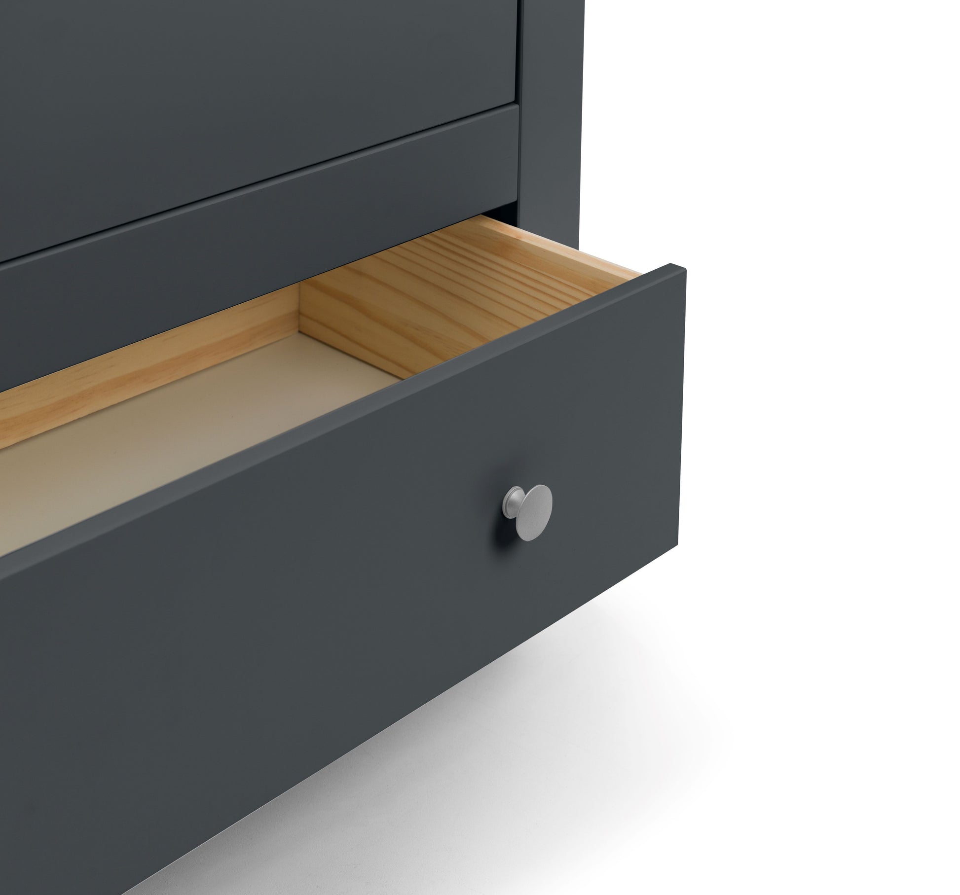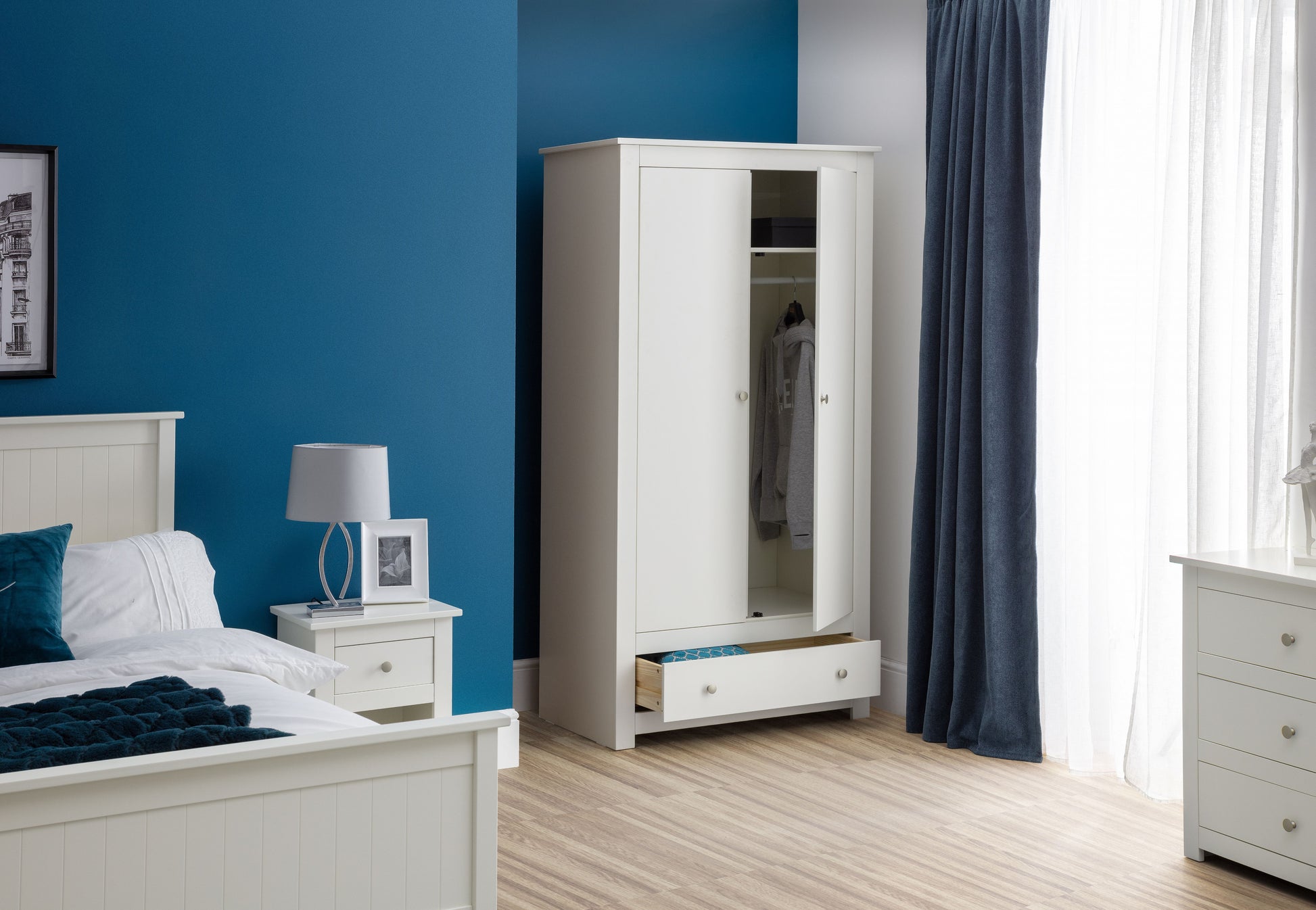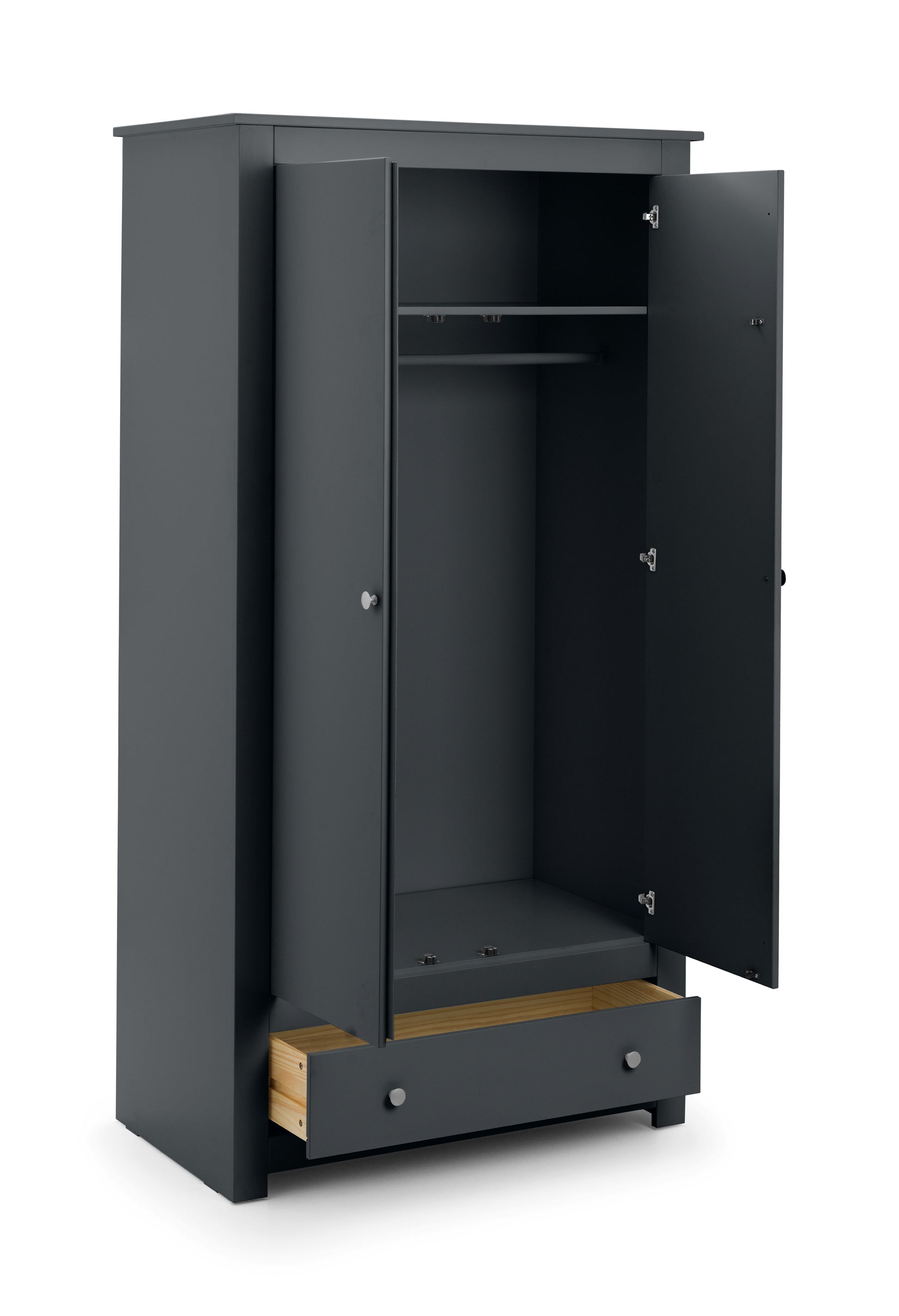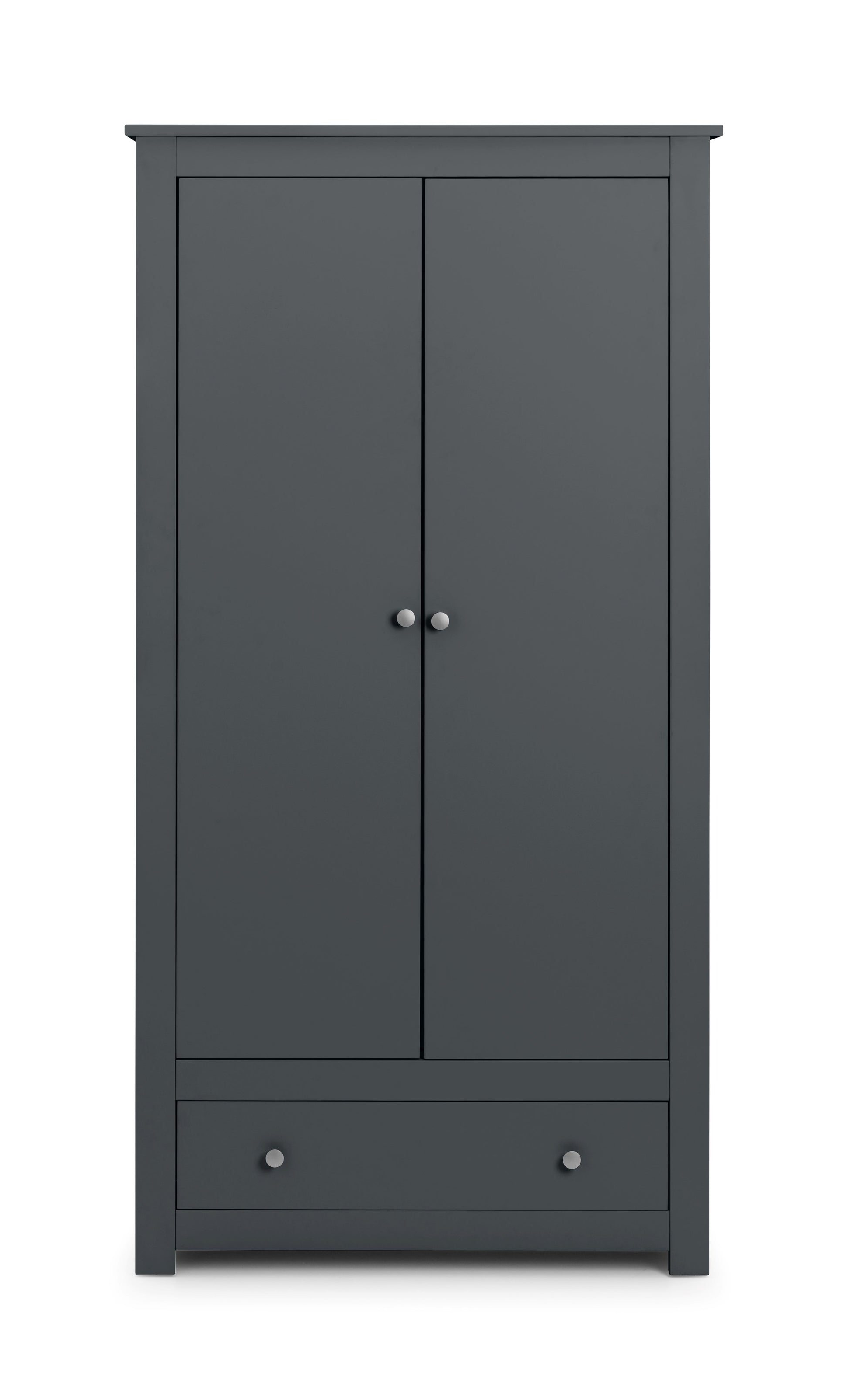 Boasting clean, simple lines the Radley wardrobe is perfectly suited for both modern or traditional styles. Featuring a hanging rail behind 2 doors, and an additonal storage drawer to store your clothes away neatly. Finished in an Surf White or Anthracite lacquer, with delicate silver handles, the Radley Bedroom Collection is perfect for adult and kids bedrooms. Simple assembly required.